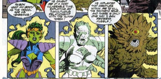 On Earth, Lyja kinda/sorta explains that the egg creature is a Skrull Sha’Barri. She further explains that Paibok the Power-Skrull implanted the creature inside her at her “weakest moment” hoping the creature would destroy the FF once the egg is hatched. Saying “This is personal” Lyja shape-changes into a second Sha’Barri and the two of them fight.