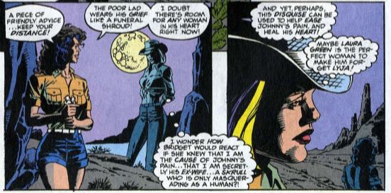 We then cut to the “Great Western Desert,” where Johnny and She-Hulk are messing around with their powers, using the desert as a makeshift Danger Room. Johnny wants to talk to the mysterious blonde who helped him out during the battle last issue, but she runs off before he gets a chance. The blonde instead meets up with feisty coed Bridget O’Neil. Bridget says the blonde is a source of much gossip. The blonde introduces herself as Laura Green, and she says she was a last-minute addition to this, their school archeology trip. They talk about Johnny, with Bridget says Johnny is recently divorced, and she tells Laura to “keep your distance.” Laura then reveals what the reader already knows, that she is Lyja the Skrull in disguise, in hopes that “Laura” will make Johnny forget he ever knew Lyja.