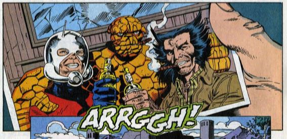 Reading the Fantastic Four comics from the start. Wolverine slashed up the Thing’s face way back in issue #374. Now we’re at issue #395 and it’s time for a rematch — not to mention another sales-boosting Wolverine guest appearance.