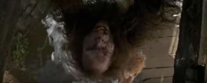 There’s a quick shot of the baby crying, suggesting that she understands what’s happening. Then the troll turns around and appears to start to climb over the side of the bridge. Willow runs at it with his fire stick. He stabs the troll right in the butt, and it does a comedic reaction shot. That doesn’t finish him off, though. Part of the bridge breaks, and Willow and the troll fall through. The troll is hanging on the bridge, and Willow is hanging onto the troll. The Eborsisk is still right there, and notices them both, one of its heads goes in for a chomp, its open mouth coming right at the camera. It bites down on the troll, pulls it off the bridge, and, in one of the movie’s more violent moments, the Eborsisk’s second head also bites down on the troll, and they pull its body apart. Then we cut to Willow hanging onto a different part of the bridge, having apparently jumped to safety.