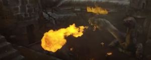Finally we get a wide shot of the castle’s courtyard. It’s not that huge of an area for everyone to be fighting in. Also, the Eborsisk appears to be half-buried in the ground. It breathes fire again, even as we can see a bunch of fires around it that it already started. Madmartigan reaches the top of the stairs, putting him on the same upper level as Willow. He calls Willow’s name. In another wide show, we see the Eborisk eyeing them menacingly while another troll climbs around the castle walls. The Eborisk breathes fire fight at the camera, only for Madmartigan to duck behind a wall and out of the fire’s path.