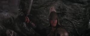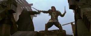 Back to Madmartigan, he has now removed that goofy helmet as he slashes another enemy soldier across the gut. Sorsha is sitting on her horse, watching him intently. Madmartigan kicks a guy in the face and runs up some stairs. Sorsha keeps watching him, as the score goes from action-y to all romantic for a few seconds.