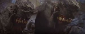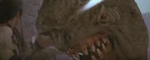 Each of the Eborsisk’s two heads have large bulges on the snout and chin. These are apparently to assist with fire-breathing, which one does right off the bat. It appears that the streams of fire come out of both its mouth and its snout simultaneously. Again not waiting around, one of the NockMaar gets burned up in the fire. Most dragon movies make you wait a little while for fire-breathing action, but not Willow.