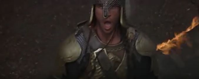 The NockMaar army bursts through the front gate, and so much happens in so few seconds, I’m having trouble recapping it all. Madmartigan lets out a battle cry and fires one of the crossbows, hitting a NockMaar in the chest. A shot of the water bubbling, reminding us where the slimy troll fell into. Three arrows hit the barrel Madmartigan is hiding behind. He pops his head up with the crossbow and fires again, hitting a second NockMaar, again in the chest. Then a closeup of him trying to reload the crossbow. It won’t work for some reason, so he throws it over his shoulder. He stands, yells again, and does his signature move of flipping his sword around, all while more flaming arrows hit the barrel.