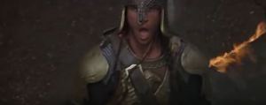 There’s a shot of Sorsha shouting “the other side!” Of what, though? We don’t know where she is. Then we see the Eborsisk again, now several arrows stuck in it as the NockMaar attempt to fight back. One reaches down, snatches a man off the back of his horse, and rears up with the man’s legs dangling from its mouth. It then gobbles them man up. A NockMaar aims an arrow and fires, hitting the Eborsisk in the neck. More arrows follow. Instead of each head doing its own thing, in this shot they are unified, moving as one as they stare down at the soldiers and roar at them.