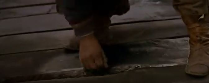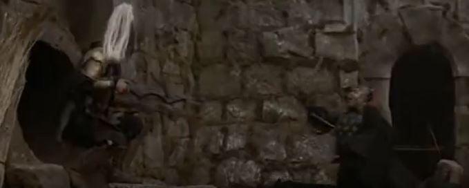 Cut to another soldier, stepping in one Madmartigan’s bear traps. Two more kick open a door, setting off two crossbows inside that Madmartigan had rigged to fire. Then there’s a bit where a bunch of NockMaar are standing next to a bunch of boxes, only for them to fall over, revealing Madmargian on the other side holding two crossbows. With a “Ha!” he fires, killing two more NockMaar. He then scrambles into a small round hole carved into the wall for his escape. I’m guessing this is some primitive sewer system?