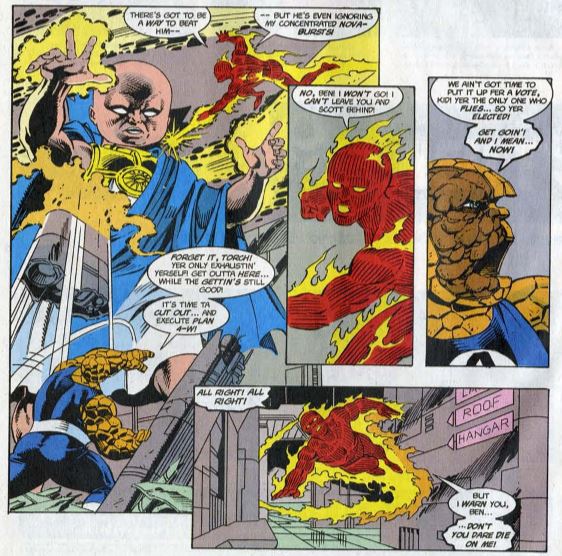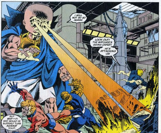 Clobberin’ time: Ben enacts the plan to stop the watcher by saying “Execute plan 4-W!” Possibly this is a holdover from his time as team leader during the Steve Englehart years.