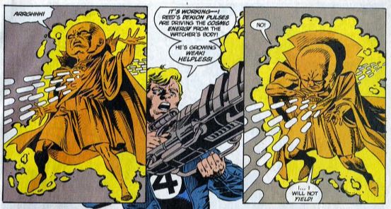 Flame on: Johnny uses concentrated nova-level bursts of fire against the Watcher. Again, it’s inconsistent as to when he has this ability and when he doesn’t.