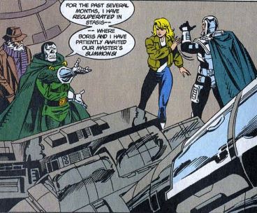 In Tibet, the Nathaniel opens the tubes, awakening the two held in suspended animation. It is not Dr. Doom but Kristoff, the pretender to Doom’s throne. The second is Boris, Doom/Kristoff’s loyal retainer. We get a short recap of Kristoff’s origin, that he was an orphaned Latverian child taken under Doom’s wing, only to go insane and believe he was Doom, to the point where he lives 24/7 in an adult-sized Doom-shaped armor. To bring home the ridiculousness of this concept, there’s even a big panel of unmasked Kristoff, showing his little kid face in full Dr. Doom regalia. Sue asks about Kristoff’s father, but Kristoff says he never knew his father.