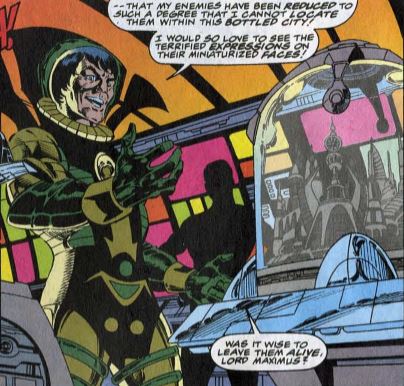 This is part eight of the eleven-part Atlantis Rising crossover, in which Atlantis rises to the surface thanks to Morgan Le Fay’s magic. Meanwhile, the Inhuman’s moon-based city of Attilan is rocked with earthquakes, so the Inhuman genetic council decides to invade Atlantis, claiming it for their own. Various Marvel superheroes get caught up in the conflict. The FF used Ant-Man’s shrinking tech to shrink all of Attilan to save the city. Then, Maximus the Mad swept in and shrunk the FF, trapping them in the tiny city.