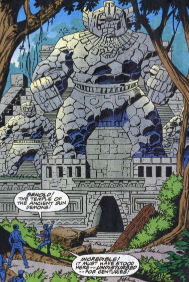 Cut to Brazil, where we are reunited with Professor Kenneth Robeson, the archeologist we met briefly in issue #389. He’s investigating the ruins of an ancient civilization that left behind sculptures with an eerie resemblance to the Thing. He chides his jungle guide Mico for illegally shooting animals for sport, and then Nico leads him and his team to more ruins, the Temple of the Ancient Sun Demons. These sculptures also resemble the Thing. Robeson and team find alien-looking machinery inside the temple. When one goon messes with the machine, it zaps him with a blast of energy.