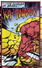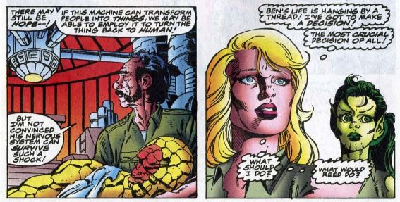 Ben re-encounters Sue, Lyja and Kristoff in the jungle, where they reveal they still have their powers in addition to their new Thing strength. Namor teleports into the middle of the fight, and Sue immediately attacks him. Ben catches up Robeson, who theorizes that the effects of the alien device might fade over time, but he doesn’t know for sure.