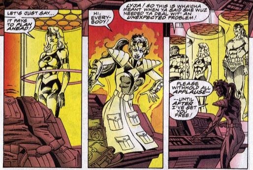 The Alicia problem: Lyja wants to call Johnny. She says it’s to invite him along on the mission, but I think it’s unspoken that she still wants to get back with him. Hyperstorm would seem to agree, as he addresses Lyja as “Mrs. Storm.”