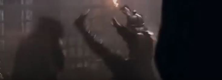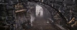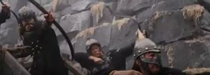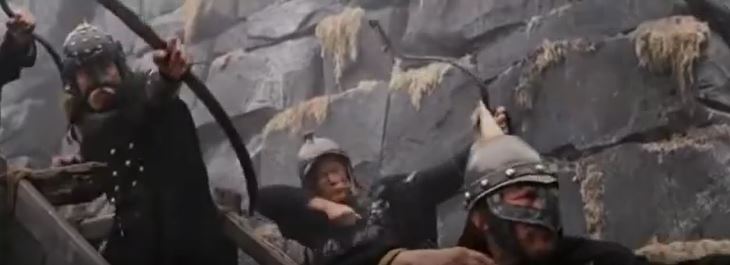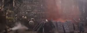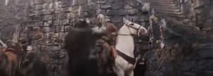 A couple of interesting points here. For one, this whole battle is staged and shot so there’s never any question as to who’s the good guys and who’s the bad guys. The armor is different, yes, but it’s also a progression of shots and progression of events so that we get a sense of the back-and-forth action. Also, in movie time, we just had a big battle a few minutes ago, so how to make this one different? It’s in cloudy weather, soon to be rain, and it’s set against the all-black castle walls, giving it a different color scheme. This courtyard also appears more confined the courtyard in Tir Asleen, more like a series of long hallways rather than a big open space in the center.