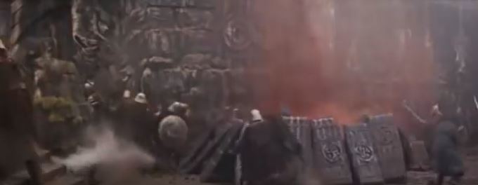 Madmartigan leads the soldiers into the courtyard through some sort of arched hallway, with gear stacked along one side. This is followed by a shot of the NockMaar inside scrambling and picking up weapons as the Galladoorn enter. A lot of action happens really quick. A NockMaar grabs a Galladoorn soldier and pulls him off his horse, followed by a Galladoorn stabbing a NockMaar right in the chest. Three NockMaar fire arrows, hitting at least one invading Galladoorn. Kael puts his skull-face mask on. Remember than when he’s wearing the mask, Kael believes himself to be an unkillable god. This will come into play before the movie is over.