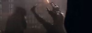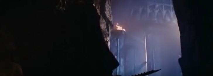 Sorsha walks into the center of the room. Bavmorda watches with a strange smile on her face. Sorsha steps up to Bavmorda and says, “I won’t let you kill that child.” Bavmorda says, “Away with you!” Sorsha walks up the baby, only for Bavmorda to raise a hand. Sorsha is magically lifted into the air, dropping her sword. It’s an Evil Dead style shot as the camera follows along with Sorsha asshe flies across the room and toward a gated wall covered with spikes. Raziel raises her wand, and Sorsha stops in mid-air, right in front of the spikes. Bavmorda and Raziel eye each other across the room. Bavmorda now has both hands up, and Raziel’s wand now glows blue. Sorsha falls to the floor, apparently out cold. Then another shot of the baby looking sad.