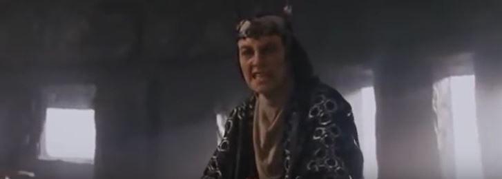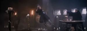 From inside, Bavmorda says, “Light the thirteenth candle!” Sorsha sheathes her sword (Why?) and she and Raziel slowly approach the door. Cut to the same door, now seen on the inside of the chamber. Raziel throws both doors open with a dramatic flourish. The chamber fills with wind, and we see the candles blow out. The camera zooms on Bavmorda, who coldly hisses, “Raziel.”