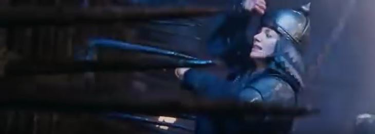 Sorsha leads Raziel and Willow up some steps, with her being very careful to keep her back to the wall at all times. Then we see some NockMaar firing arrows from behind shield men, causing a Galladoorn horse and rider to fall into the mud. Airk shows up at this point, atop the castle wall. There’s a big vat of boiling oil or acid being guarded by a NockMaar, only for Airk to sneak up behind him and slash his throat. Airk then sees that same group of shield men. With an action-hero grunt, he pulls a rope, turning over the boiling acid. The steaming blood-red liquid (What is this stuff?) lands perfectly onto the archers protected by the shield men, causing the whole group of enemy soldiers to scatter.