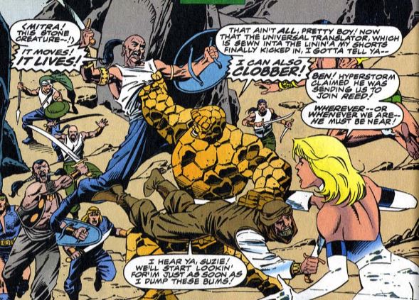Previously, our heroes encountered the godlike villain Hyperstorm, who has Dr. Doom held captive in his otherworldly tower and seemingly killed the FF in the same way that Reed was killed way back in issue #381. Surprise! The Fantastic Four aren’t dead. When Hyperstorm zapped them, he didn’t kill them, but teleported them somewhere. The FF — in this case Sue, Ben and Kristoff, with guest stars Lyja and Namor the Sub-Mariner — are in a rocky, desert-like landscape, where they are immediately attacked by “hill pirates.” Namor knows these guys from somewhere, apparently. Our heroes easily defeat the pirates, while Sue speculates that Hyperstorm has sent them to a world where Reed is still alive. Namor spots an alien city in the distance, and they head for it.