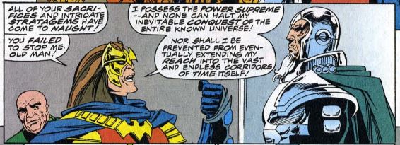 Back in Hypsertorm’s tower, which is in another universe, Hyperstorm gloats to Nathaniel Richards, whom he’s taken captive. Hyperstorm says his goal is nothing short of the conquest of all time and space. When Hyperstorm leaves the room, Nathaniel asks Zarrko the Tomorrow Man about him. Zarrko says Hyperstorm saved him from being trapped in the timestream. (This happened after his conflict with aliens called Time-Twisters in Thor #245.) Zarrko also believes that he is not Hyperstorm’s sidekick, but his “business partner.”