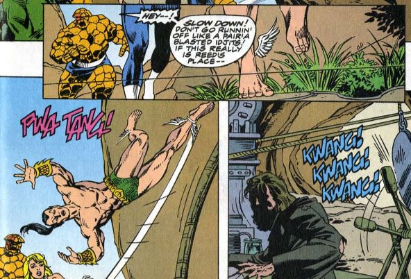 The FF arrive at the hermit’s cave, only to find a crazy-looking device outside, which Namor identifies as a hydroelectric generator, far beyond the technical level of anyone on this world. Before we all congratulate Namor for being smart, he then steps over a wire, tripping a homemade alarm. Turn the page, and there’s good old Reed, looking all bearded and disheveled.