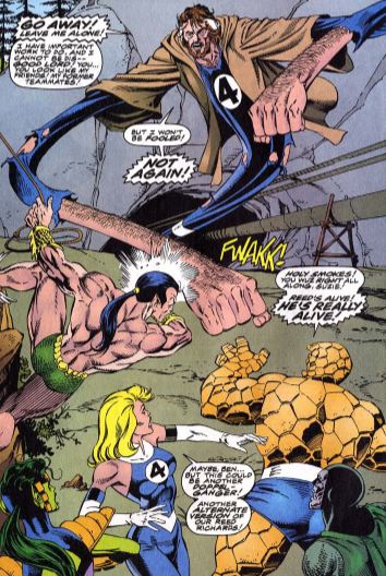 A fight breaks out, as the FF fears this might not be the real Reed, and Reed doesn’t believe for a second that this is the real FF. Sue approaches Reed, admitting that they’ve both changed since they’ve been apart. They talk for some time, with the reader not privy to the conversation. The finally conclude that it’s really them, and they fall into an embrace.