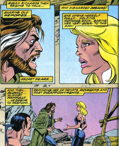 Fade out: Sue refers to Namor as handsome early on, but then forgets him once Reed is back in the picture. We get one panel of Namor staring coldly at the two of them, which resolves (for now) his pursuit of Sue.