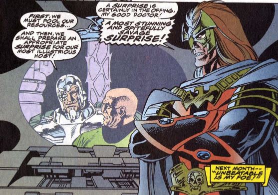 Fantastic fifth wheel: If Hyperstorm is so all-powerful, why didn’t he know that Kristoff’s armor could get Reed home? Also, we see Kristoff walking around in his Dr. Doom armor but without the helmet, for a little-kid’s-head-on-a-grownup-body look, and it’s just as silly as you’d think.