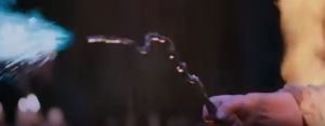 Then we’re back inside the ritual room for crazy magic fighting! Bavmorda reaches her hand into a burning lamp of some kind, which somehow didn’t get blown out with all the candles in the previous scene. She has a fireball in her hand, which she throws at Raziel. Raziel gets surrounded by flames. Bavmorda smiles, thinking she’s won, but Raziel’s non-burned hand bursts out of the flames holding the wand. The wand then shoots ice and snow at Bavmorda, all while Raziel is still hidden behind the magic fire. There’s a shot of Willow watching all this from outside the room, keeping our hero present in the scene.