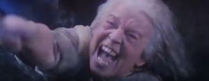 Raziel stands up, with no info about how she got out from under the pillar. There are quick shots of an unconscious Bavmorda, Willow, and the baby. Raziel has a big ol’ grin on her face as walks over to Bavmorda’s body, wand at the ready. Bavmorda’s face is covered by part of her robe. Raziel uses the wand to uncover Bavmorda’s face. It looks like Bavmorda is dead for a moment, only for her to go all Large Marge by coming back to life and screeching at Raziel for a jump scare. It works, because Raziel gets so startled she drops the wand again.