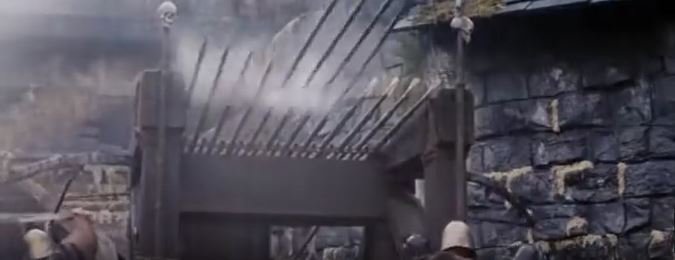 We cut from the ritual room back to outside, where Madmartigan is fighting two guys. He flips one over his shoulder as a second one runs up with a spear. He does a cool spin move with his sword to block the attack. Then there’s a quick bit with the Brownies, showing they are involved with the battle after all. They use their knives to cut a rope on a sort of medieval arrow machine (I believe this is called a hwacha, but I could be wrong). The arrows fly into a group of NockMaar, and one of them dies with the second Wilhelm scream of the movie. The Brownies cheer in triumph.