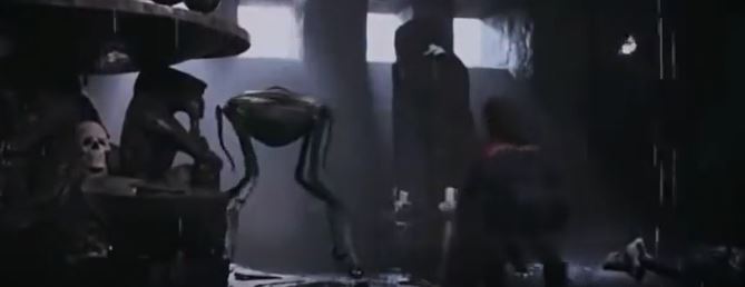Action-hero music plays as Willow runs into the room, ducking out of the path of the lighting, which causes sparks and smoke all around him. He makes it about halfway through the room when the lightning strikes a… hey, just what is this thing? It appears to be a container filled with bones, with four legs like a table. It comes to life and is a bona fide monster for this next bit. The fan wiki doesn’t say what this thing is, but it confirms that the spell that brought it to life is transmutation, temporarily animating an inanimate object. The wiki states that this spell was another one of Bavmorda’s specialties. The container chases Willow around some more pillars in the room, making hissing and growling noises. Listen carefully, and you can hear Willow say “Yikes!” as it pursues him. The skeleton hands inside the container open the lid up and down like it has a mouth.