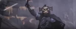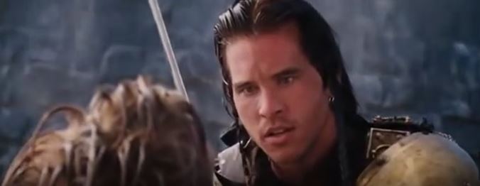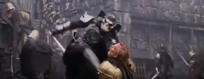Madmartigan falls back, with Kael falling with him. This move impales Kael (heh) on Kael’s own sword. Both men stand, and we see Kael now has two swords sticking out of him. Madmartigan throws Kael over the bridge. Kael falls with a scream while lightning flashes in the background. In the reverse shot, we see his body, lying there in the mud. A bunch of Galladoorn soldiers run past Kael’s body as if it isn’t there. The important detail to remember during this Madmartigan/Kael fight is that, according to the tie-in fiction, Kael believes himself to be an unkillable god when wearing his mask, and a vulnerable human without the mask. Therefore, smashing the mask is what weakened Kael enough to be defeated — in Kael’s mind, at least.