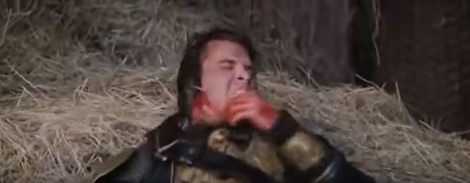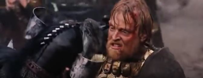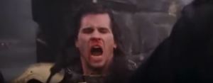 Kael rears back, and we think the fight is over. But he’s not done. Instead, he swings and punches Madmartigan in the face. This gives Madmartigan a bloody nose, for even more gore. Madmartigan stabs Kael in the gut with his second sword. Kael punches Madmartigan so hard he withdraws the sword out of Kael and drops it, so that it goes flying behind him. Kael wraps both hands around Madmartigan’s neck, choking him. Madmartigan drives the first sword in deeper, which causes Kael to loosen his grip and fall back.