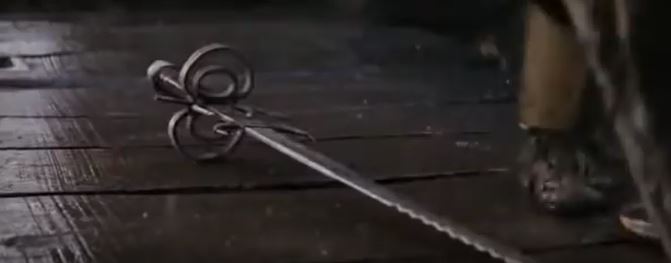 Next, Madmartigan steps on another sword’s hilt so that the blade sticks up at an angle. But wait, this sword has fancy rounded hilt, like a Princess Bride sword, but Madmartigan’s second sword has a basic T-shaped hilt, like a Lord of the Rings sword. Compare with earlier shots, and it’s easily confirmed that this is Kael’s sword, which he dropped when Madmartigan stabbed him the first time.