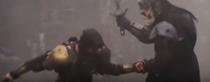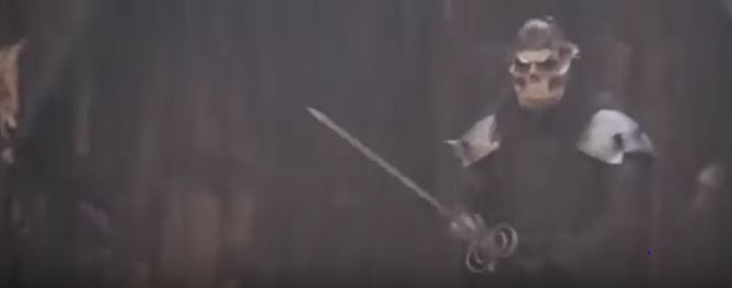 Kael looks very Darth Vader-ish as he approaches, holding his sword two-handed like Vader’s lightsaber (and like a Kurosawa Samurai before him). Madmartigan runs up with a battle cry. Their swords clash once, only for Madmartigan to jump and swing around in midair, slashing Kael in the face. Part of Kael’s mask breaks away. Kael stumbles back against a wall, and we see blood on his face.