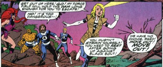 Sue manages to stop Black Bolt’s voice by cutting off his oxygen with a force field, knocking him out for real this time. The dam, however, is even more damages, already causing flooding. Everyone retreats while Sue stays behind to hold the dam together with her force fields. Once the heroes make it back to the ship, and it’s decided that Namor should go back for Sue, despite Reed’s misgivings.
