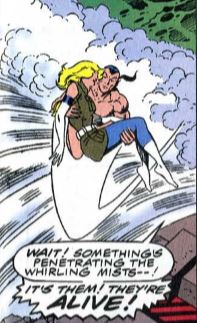 Namor arrives to rescue Sue just as she passes out from the strain of holding the dam together. The dam collapses, flooding the whole area. At first it looks like they didn’t make it, but Namor and Sue emerge from the water. (Who’d have thought the undersea guy could handle water?) Back aboard the ship, both Black Bolt and Sue are put in stable condition, and Reed is not cool with Namor’s now-obvious obsession with Sue.