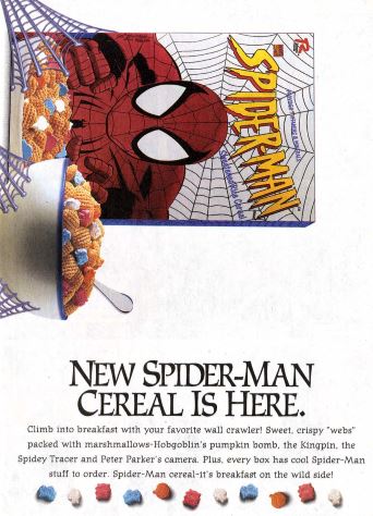Commercial break: The Spider-Man cereal! They tried convincing kids that the rice chex were “webs.”