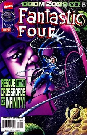 At the Crossroads, the Silver Surfer tells Reed that Galactus is dead, having been killed by his new herald, Morg. (This happened in Silver Surfer #109.) Reed says he needs to know where this happened, and the Surfer gives him the coordinates before flying off. Reed signals Franklin to bring him back to HQ, but the fight against Doom 2099 breaks into the Negative Zone room, interrupting Franklin’s retrieval efforts.
