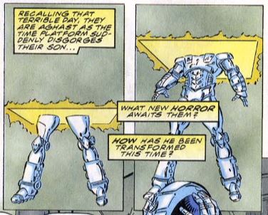 That mystery is put on hold when Franklin successfully brings Reed back from the Crossroads. Reed says the Silver Surfer’s information has finally given the FF a way to defeat Hyperstorm. As he says this, we see that Hyperstorm is secretly watching them. Then a time platform (like from Dr. Doom’s old time machine) appears above teenage Franklin. Too fast for anyone to react, it takes Franklin away in time. Seconds later, Franklin reemerges from the time portal, only this time he’s back to being a little kid again, just like before the whole “teenage Franklin” thing was introduced.
