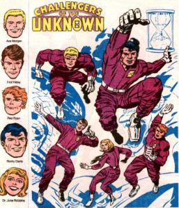 In Challengers of the Fantastic, the FF get combined with DC’s Challengers of the Unknown, four adventurers who survived a near-death experience and decide to help others while they are “on borrowed time.” (If you ever read Challengers of the Unknown, you’ll read the words “on borrowed time” a LOT.) The first page gives us the lowdown on our new heroes: