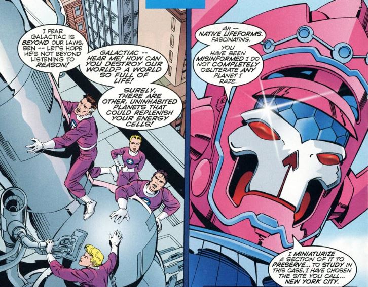 Prof tries and fails to reason with Galactiac, and Galactiac prevents Ace from calling in a S.H.I.E.L.D. airstrike. Uatu reappears and sends Red on a mission. Inside the building, June talks to the Silver Racer, asking for his help and reminding him of his long-repressed humanity. When Rocky tries destroying part of Galactiac’s machine, Galactiac responds by transforming him into a four-armed orange rock monster… a Thing!