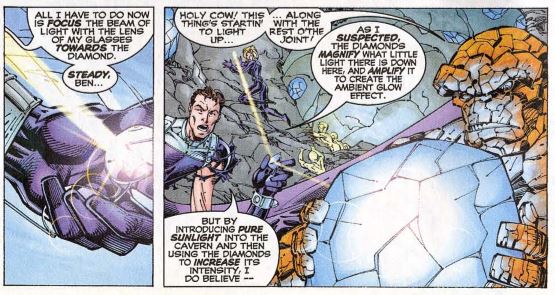 Fade out: Sue turns part of the Mole Man’s cave wall invisible, just enough for light from outside to steam in. This again begs the question of how do her powers work around light again?