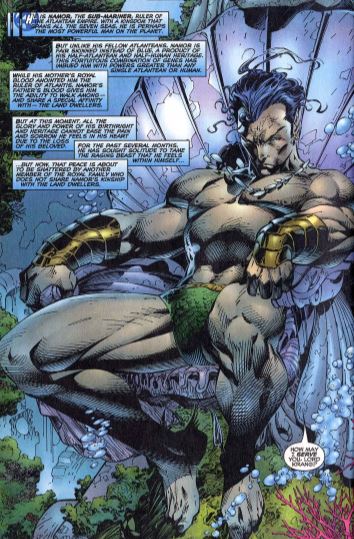 Namor gets a splash page (heh) introduction, explaining his half-human heritage and his recent ascension as the new ruler of Atlantis. The caption states, “He is perhaps the most powerful man on the planet.” Namor is moved by Krang’s description of the “black poison” from the surface world, and he says the time has come for humans to feel the wrath of Atlantis.