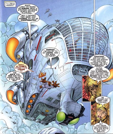 Elsewhere, the FF wake up, having been knocked out by a “synaptic scrambler.” They’re trapped in a plain white room, now wearing matching white suits. They figure out how to escape by using their powers in tandem. They’re attacked by gun-wielding guards, so Ben punches a hole to the outside, only to discover they are on board a giant floating platform. (You and I know this is a S.H.I.E.L.D. Heli-carrier, but the comic frustratingly never tells us that this is S.H.I.E.L.D. So much for attracting new readers.) The FF are captured again and taken before Director Nick Fury.