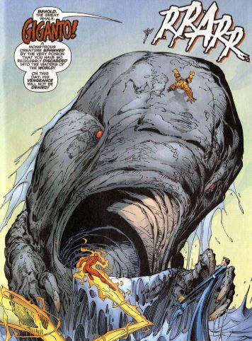 In NYC, Namor is out just randomly trashing cars when Ben and Johnny drop down from above. Namor easily punches out Ben, but decides his army isn’t enough. He uses his trumpet horn (which he just had on him, I guess) and he summons the giant monster Giganto, saying his vengeance will not be denied.
