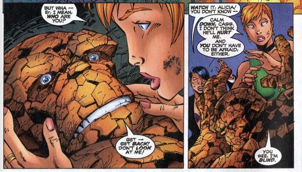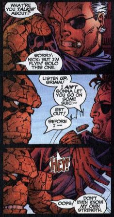 Clobberin’ time: Ben’s whole story arc in this issue is regaining his confidence by reclaiming his fighter pilot skills. His meeting Alicia, who is not horrified by his appearance, no doubt helps as well.
