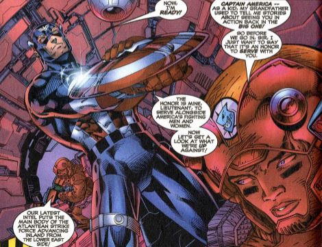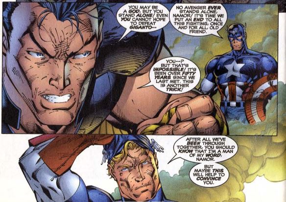 Just when it looks like Namor has won, he gets struck from by Thor’s hammer. Both being immortal (or at least long-lived), the two of them have some familiarity with each other. Captain America joins them, pulling off his mask. Namor is shocked, as the two of them knew each back in World War II.