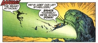 Reed deduces that Namor has not collapsed because of pollution, but that he’s been poisoned by a rare “sea wasp.” Dorma says Krang has deceived Namor, and Namor regains consciousness to swear revenge. Nearby, Ben sets the quinjet to self-destruct and flies it right into Giganto’s mouth. Giganto dies in a fiery explosion. It looks like a kamikaze flight, until Johnny swoops down from the sky and saves Ben from the blast.